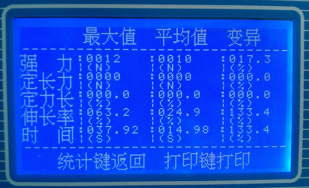 ”,試樣斷裂后,儀器會(huì)自動(dòng)復(fù)位到夾持位置,如此反復(fù),做完試驗(yàn)后,按“統(tǒng)計(jì) ”鍵統(tǒng)計(jì)數(shù)據(jù),如下圖: