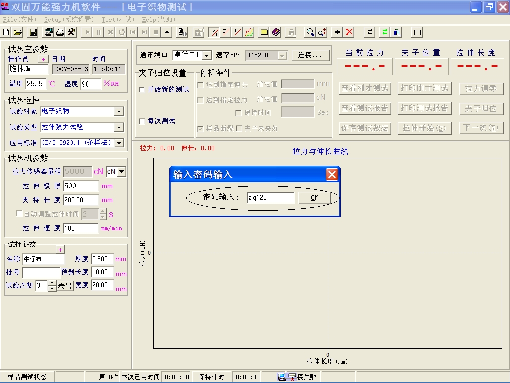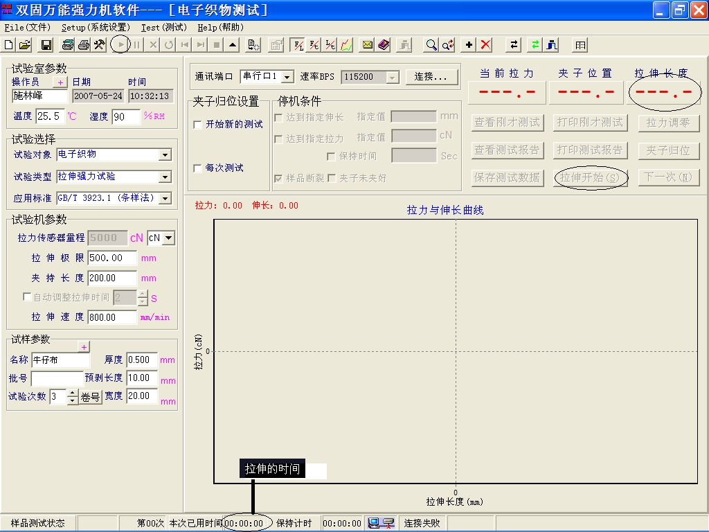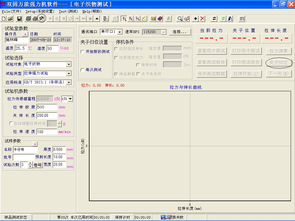 如果發(fā)現(xiàn)測試試樣的時候,總是要拉一段時間才開始出現(xiàn)曲線及強力值,那么很有可能是做實驗之前沒有點擊拉力調零,程序內部有負值,產生這樣的原因很有可能是掛上試樣以后又重新點擊了“拉力調零”,拉力調零只有在試樣沒有掛上去之前點擊,切記!