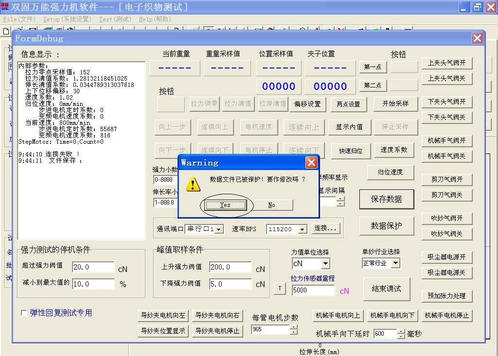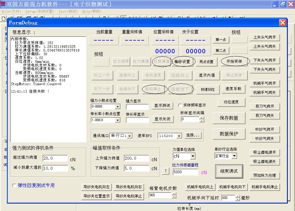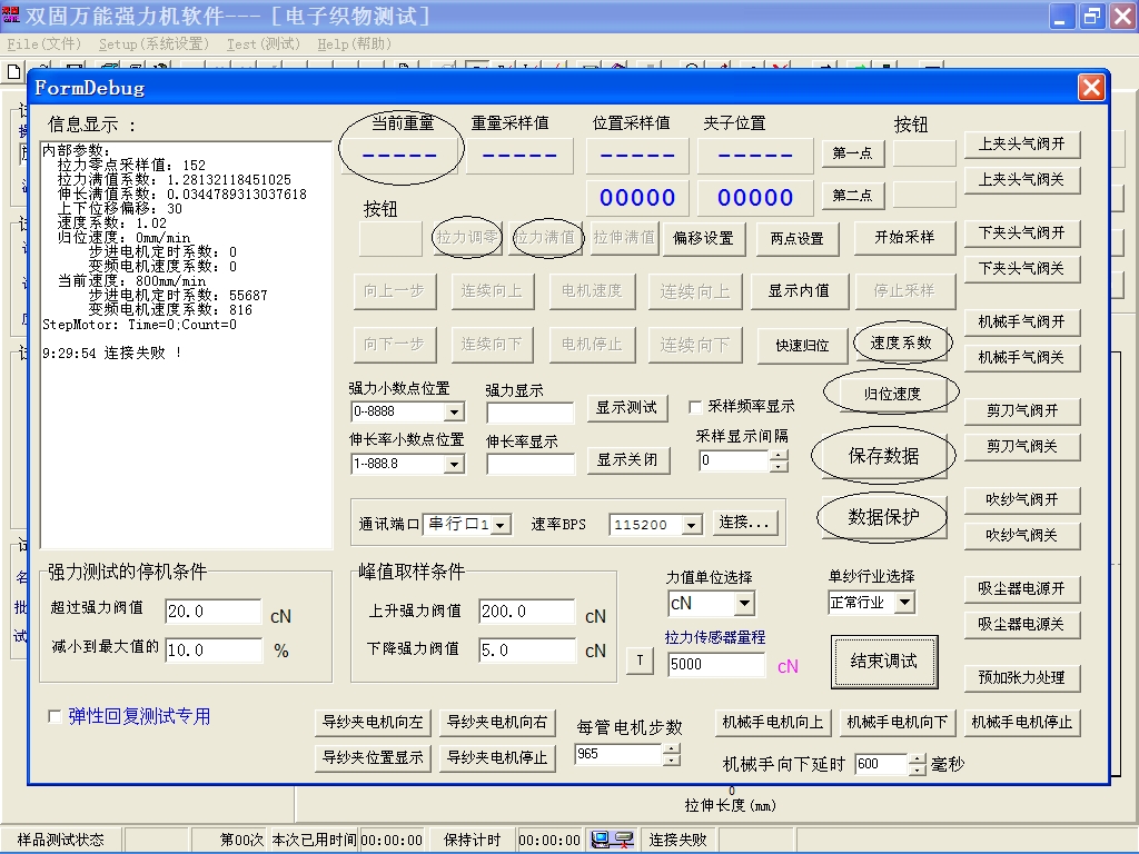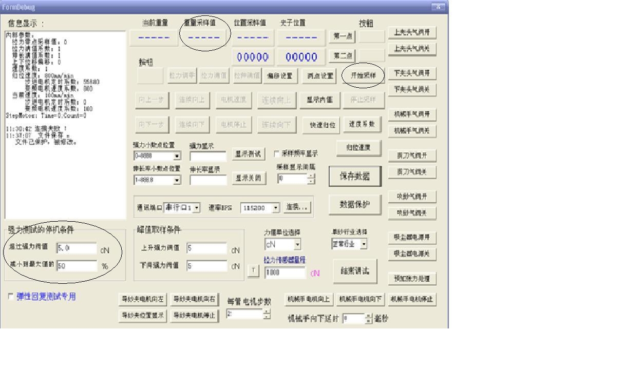 如上圖左下角,“強力測試的停機條件”,超過強力閥值處設置的太大,就有可能試樣拉斷了以后不停(比如試樣的強力只有50cn,而此處的閥值為60cn,則強力測試完成后無法停機),那么可以將此處的閥值設置小一點。