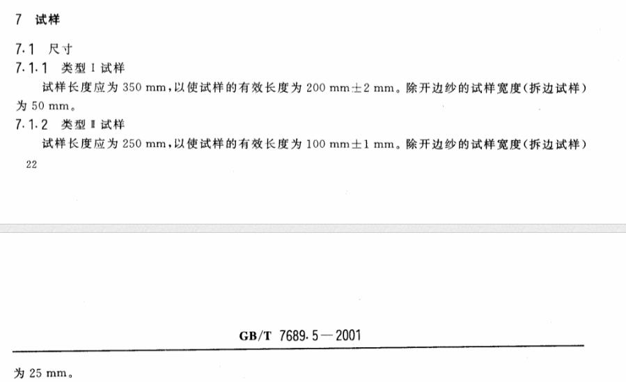 第二種試樣長度為250mm,試樣有效長度為100mm,除開邊紗的試樣寬度應(yīng)為25mm。
