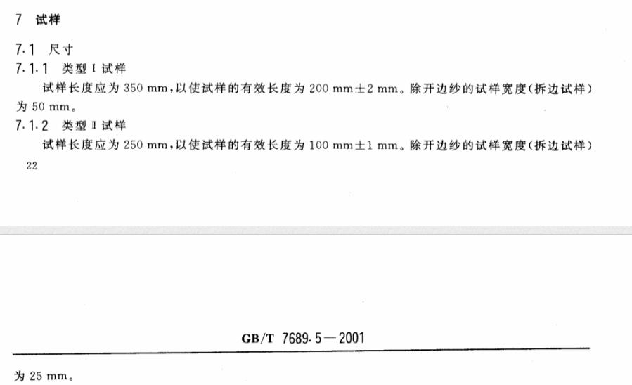 第二種試樣長(zhǎng)度為250mm,試樣有效長(zhǎng)度為100mm,除開邊紗的試樣寬度應(yīng)為25mm。