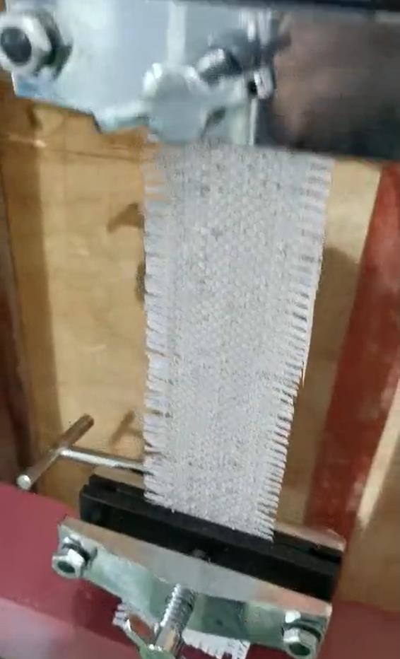 以縫紉卷折面為取樣面,在每個袋上取經(jīng)向、緯向、縫邊向、縫底向試樣各兩塊,長300mm,寬約為 60mm,如果測經(jīng)向拉伸強(qiáng)力,通過撕掉緯向部分單絲面將經(jīng)向?qū)挾刃拚?0mm;如果測緯向拉伸強(qiáng)力,通過撕掉經(jīng)向部分單絲面將經(jīng)向?qū)挾刃拚?0mm。如最后一根超過半根則留之??p向試樣的兩邊縫線應(yīng)適當(dāng)留長,兩邊各打三道結(jié)。
