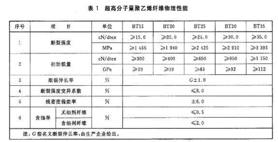 超高分子聚乙烯纖維根據(jù)斷裂強(qiáng)度分為BT15,BT20,BT25,BT30,BT35五類。