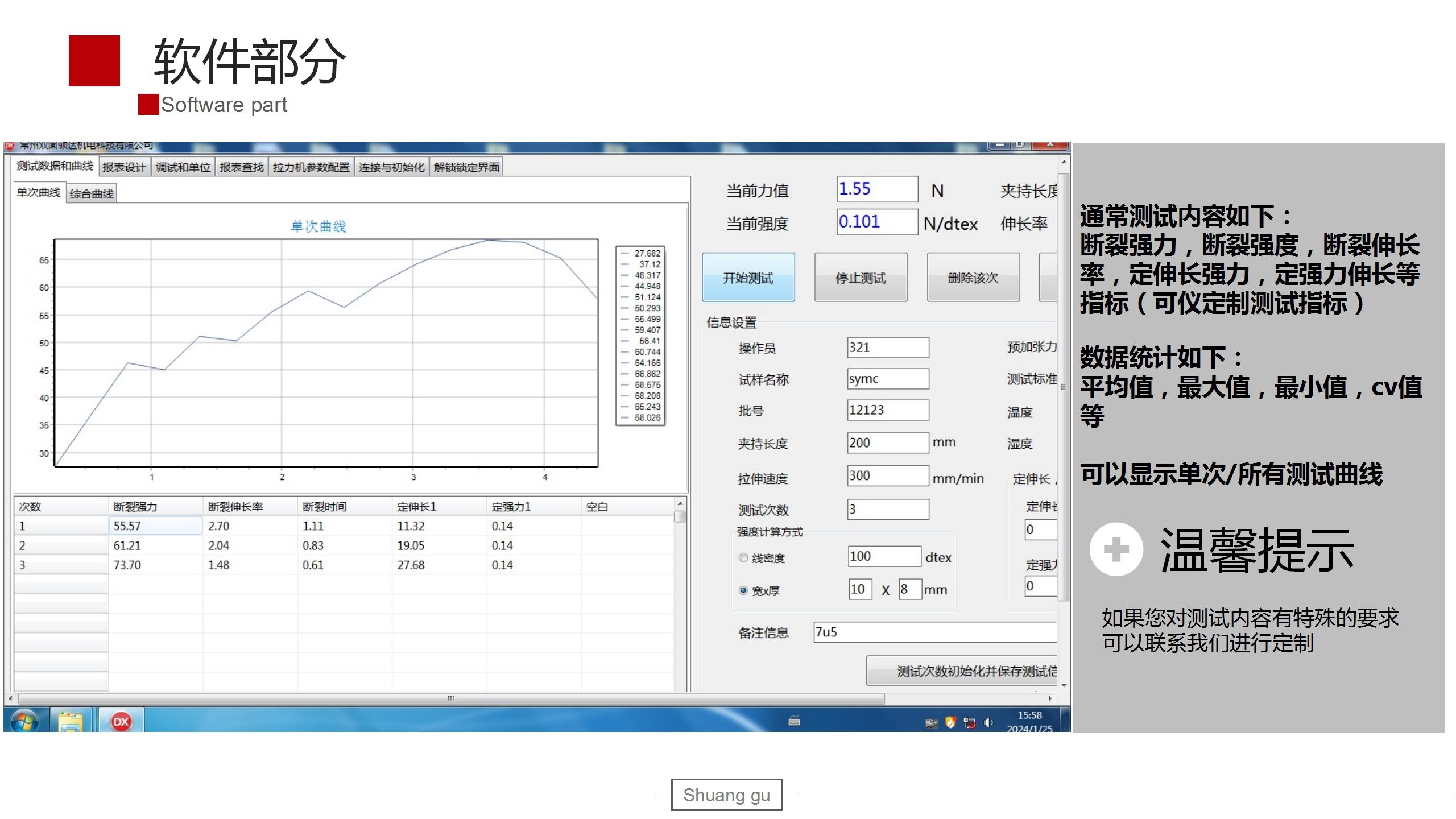 YG020G型氣動夾具電子單紗強力機(液晶款)用于各種棉、毛、麻、絲、化纖、包芯紗的單根紗線和纖維純紡或混紡紗線的斷裂強力和伸長率及相關(guān)指標,該設(shè)備需連接電腦,用戶可選擇自配電腦或廠家配套電腦。