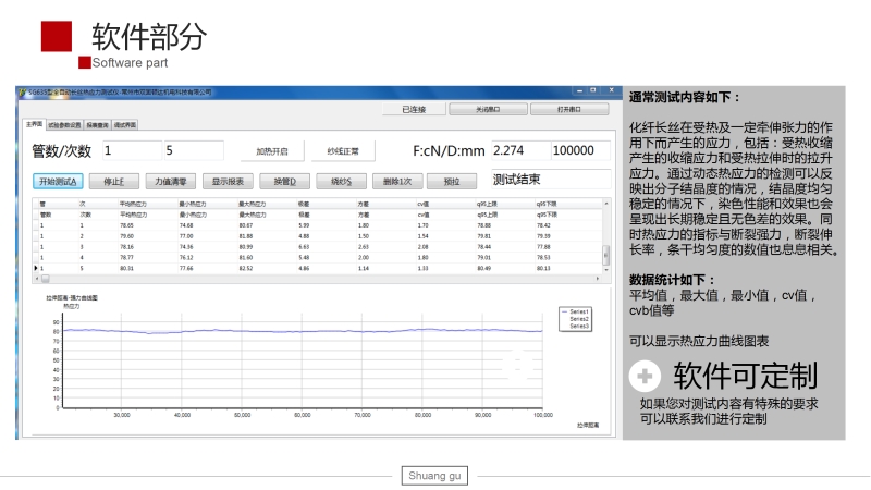 SG635型全自動長絲熱應力測試儀采用計算機控制,用于測定POY長絲經(jīng)過加熱、牽伸后的應力,并計算出應力的平均值、最大值、最小值以及均方差和CV值。根據(jù)這些檢測的結果中的測試結果、變化或干擾在早期階段會變得明顯,這些指標能直接反映后道DTY的染色性能,從而能夠迅速的采取補救措施。
