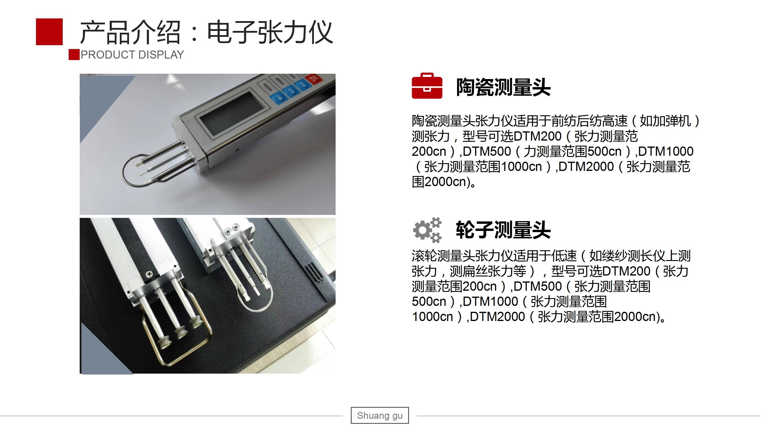 DTM200型紗線張力儀用于各種毛、麻、絲、化纖及金屬拉絲、玻璃纖維和光導(dǎo)纖維等產(chǎn)品的靜、動(dòng)態(tài)張力檢測(cè),為提高紗線質(zhì)量和產(chǎn)品服用性能提供可靠的依據(jù)。