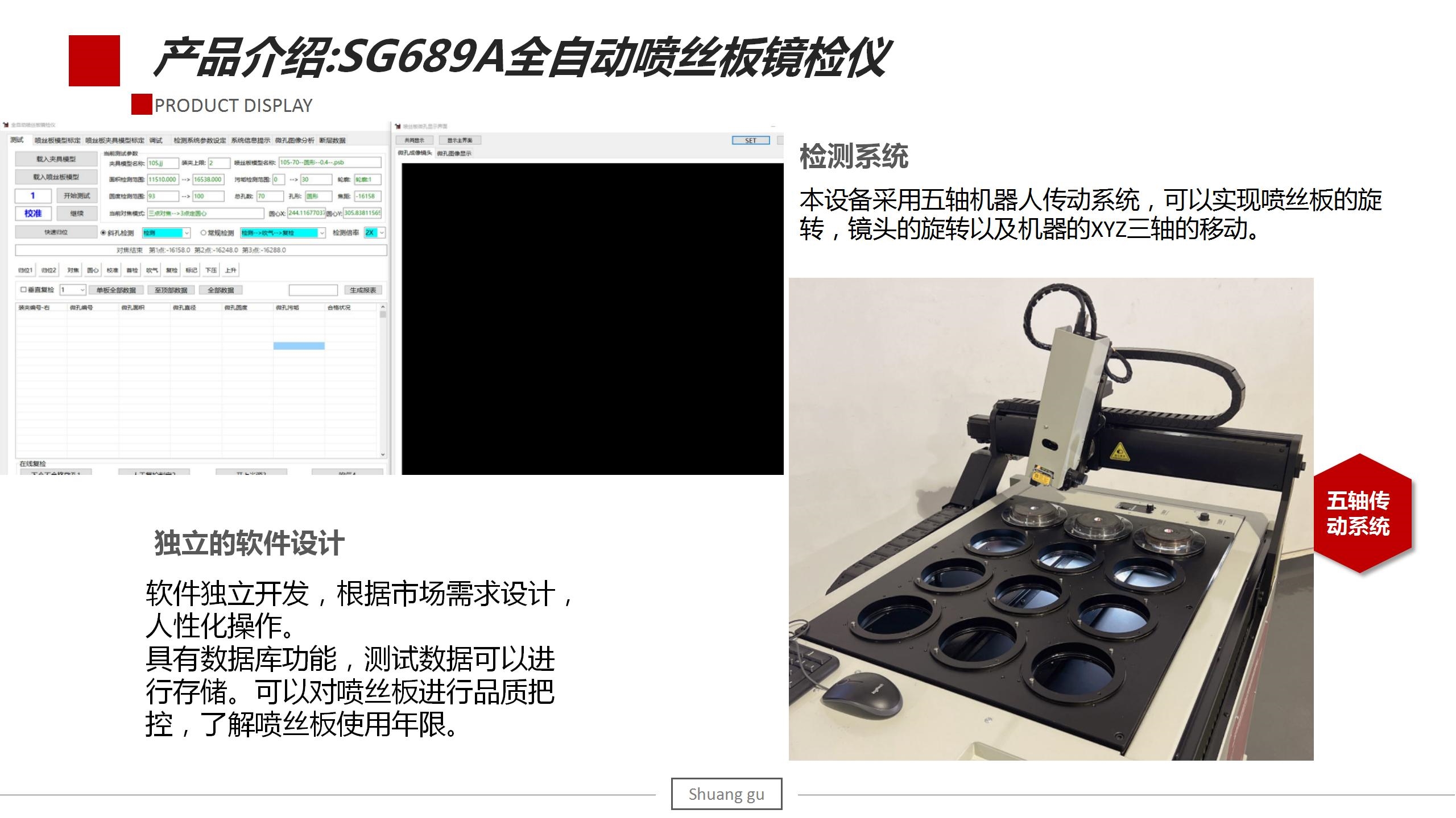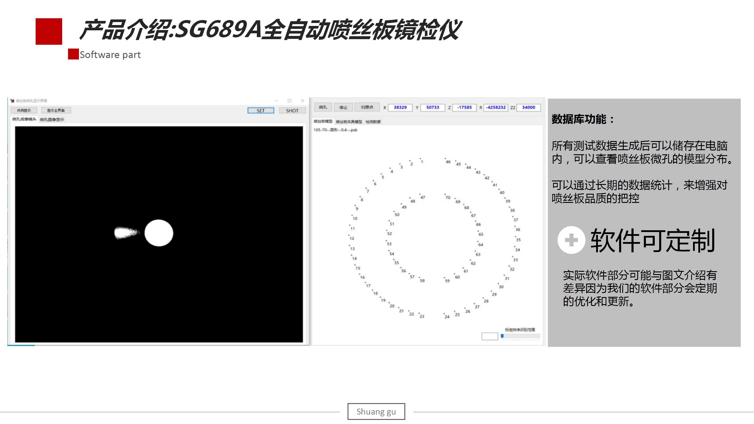 SG689A型全自動(dòng)噴絲板鏡檢儀(測(cè)雙斜孔)用于檢測(cè)各類斜孔噴絲板的紡孔尺寸大小及是否堵塞的專用儀器。化纖絲的類型主要有雙組份并列復(fù)合纖維,GPN高收縮滌錦復(fù)合纖維等復(fù)合纖維等,此檢測(cè)系統(tǒng)可以檢測(cè)斜孔板/常規(guī)板微孔的直徑、面積、圓度、污垢率及微孔合格情況,還可定制紡孔內(nèi)壁斷層掃描功能。除此之外,我們也可以根據(jù)實(shí)際情況滿足客戶關(guān)于特殊異形孔板的檢測(cè)。