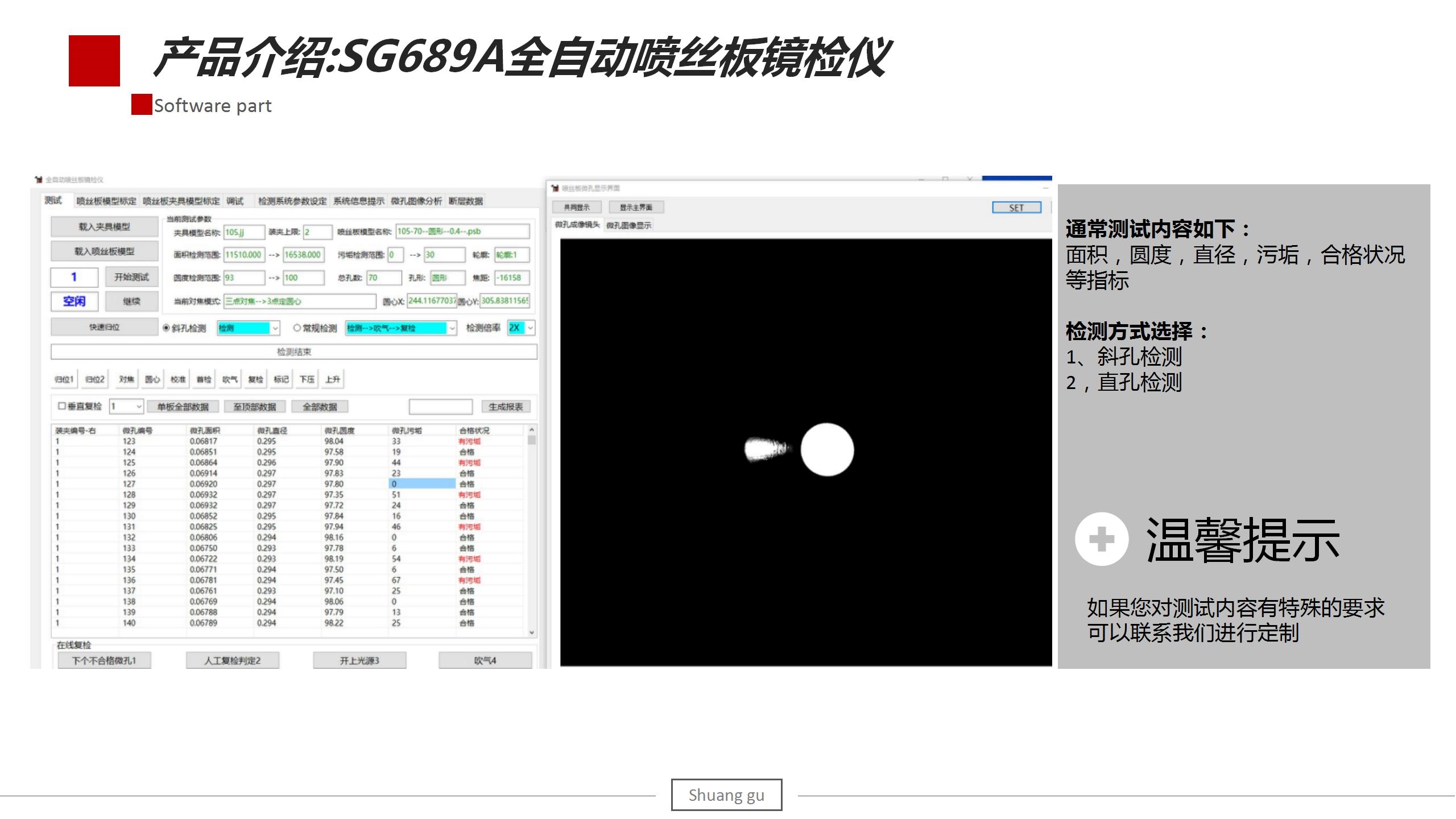 【檢測(cè)項(xiàng)目】1.微孔直徑、面積、圓度、污垢率、微孔合格情況,特殊異形孔尺寸等數(shù)據(jù),用戶可以在程序上自行設(shè)定判斷標(biāo)準(zhǔn),判斷微孔是否合格,微孔面積是否過大或過小,所檢測(cè)的微孔狀態(tài)是否符合設(shè)定的范圍,檢測(cè)出的不合格數(shù)據(jù)程序上會(huì)用不同的顏色標(biāo)注出來。