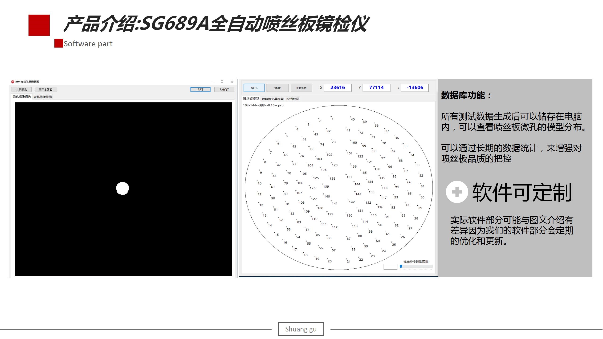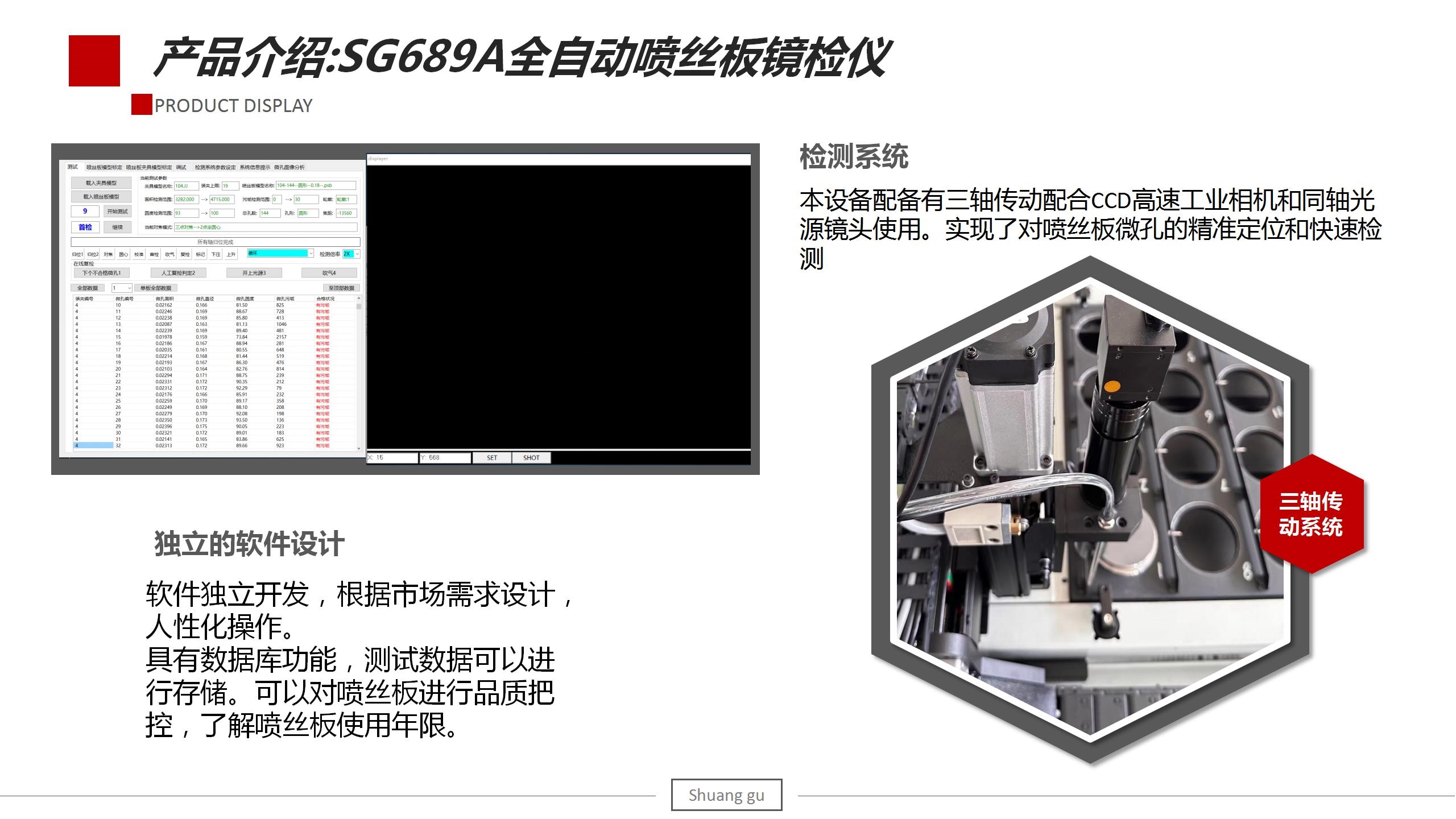 SG689A型全自動噴絲板鏡檢儀(檢測儀)用于檢測各類化纖絲噴絲板(紡絲板或紡口板)的紡孔尺寸大小及是否堵塞的專用儀器?;w絲的類型主要有工業(yè)絲、草坪絲、海島纖維、BCF、POY、DTY、特種纖維、碳纖維、芳綸、錦綸(尼龍)等。此檢測系統(tǒng)可以檢測常規(guī)板微孔的直徑、面積、圓度、污垢率及微孔合格情況,還可定制紡孔內(nèi)壁斷層掃描功能。除此之外,我們也可以根據(jù)實際情況滿足客戶關(guān)于特殊異形孔板的檢測。